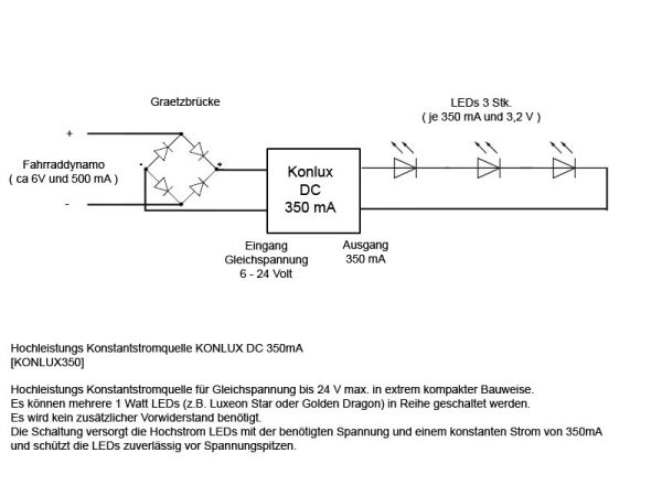 Hallo! Die Konstantstromquelle wird nur verhindern, dass der Strom nicht über 350mA steigt. Hinter den Gleichrichter solltest du einen Elko schalten mit ca 470µF. Nehmen wir an, die LED brauch dafür 3,2V und du Schaltest 3 in Reihe, dann müsste der Dynamo schon mindestens 7V effektiv erzeugen. Wenn er das nicht tut, wirst du die 350mA auch nicht erreichen. Durch den Elko wird der Effektivwert der Pulsierenden Gleichspannung verbessert. Dadurch werden die LEDs auch nicht flackern. Wenn du keinen Kondensator verbaust, dann musst du wesentlich stärker in die Pedale treten. Das Flackern ist wohl eher ein Flimmern, was du sicher nicht während der Fahrt bemerken wirst.