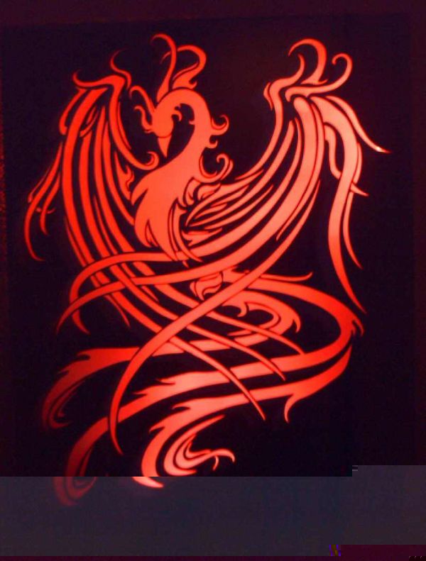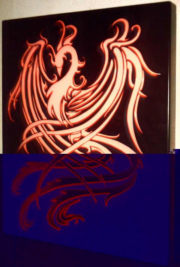 Ich bin Metallbauer und arbeite mit einen CNC Laser und habe dort schon einiges für mich selbst gemacht . Unter anderem Ein Bild eines Phönix das ich aus Blech gemacht habe die Konturen sind praktisch frei und mit einer satinierten scheibe hinterlegt. Dahinter hab ich zwei LED Leisten eines Discout PC Zubehör Händlers montiert die man an die haushaltsteckdose anschliessen kann ! Sieht echt Klasse aus ( schade wenn ich ne digicam hätte würd ich ein bild reinstellen) aber da es kabelgebunden ist und die leisten recht breit sind 30 mm (scheibe-Leiste-Schalter-Kabel)ist es ersten nicht mobil ( ich kann es nicht einfach umhägen da es ja ne steckdose braucht) , das kabel sieht nicht unbedingt schön aus .... und es ist etwas tief in der bauart ( durch die fetig LED Leisten )!