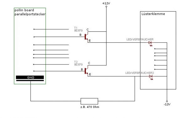 Die Leds mit Vorwiderstand im Emitterkreis anzuschließen hat zusätzlich den Vorteil, dass ein Potentialausgleich über den Vorwiderstand der LED und die LED selbst abgeschwächt bzw. in einer Richtung fast ausgeschlossen wird, solange das Netzteil nicht angeschlossen ist und damit im LED-Stromkreis kein Strom fließt.
