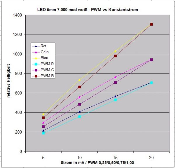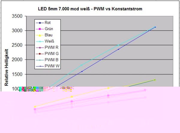 Ganz eindeutig zu erkennen, bei PWM Ansteuerung ist der Helligkeitsanstieg der