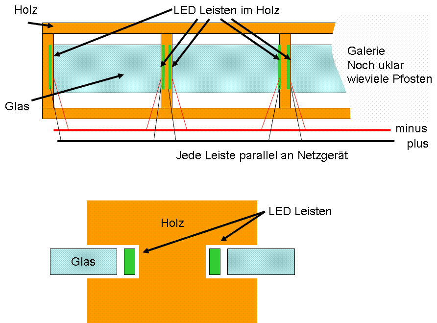 Geplant wäre in jeden Pfosten eines Geländers links und rechts eine LED Leiste zu setzten. Diese leuchtet dann in das Glas zwischen den Pfosten, Gravur im Glas würde dann auch gut aussehen, aber das kommt evtl. noch später.