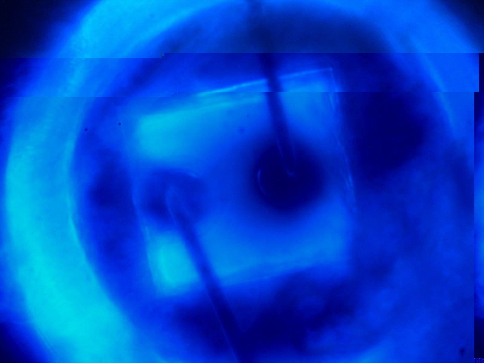 Ich hab mal ein Mikroskop-Bildchen von den Bondkontakten angefügt. Bei dem unteren Bondkontakt sind Risse in Höhe des Pads zu erkennen (Golddraht spiegelt sich an Bruchkanten)(Hab ich mir zumindest so sagen lassen). Solche spiegelnden Brüche kann man in allen kaputten LEDs finden (Habe es anfangs misinterpretiert, deshalb sagte ich in früheren Postings das die Bondkontakte ok aussehen :roll: )