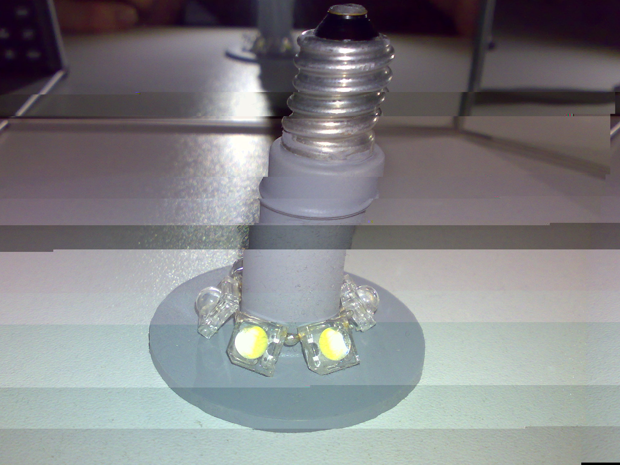 Diese Leuchtmittel bestehen aus 0,88µF Kondensator (4mal 0,22µF), einem 220ohm Widerstand, einem Brückengleichrichter und 3Chip Superflux LEDs.