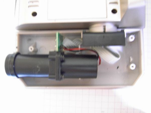 Hier der innere Aufbau des Projektors. Man muss einfach die 5mm Led, die sich in der schwarzen röhre befindet vorsichtig herausziehen und die neue Led hineindrücken und verlöten. Ich habe zusätlich noch einen Poti hingebaut da mir die Led etwas zu hell ist.