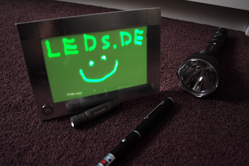 Lässt sich mit blauen weißen und uv leds oder Laser beschreiben und im dunkel lässt es sich über mehrere Stunden lesen