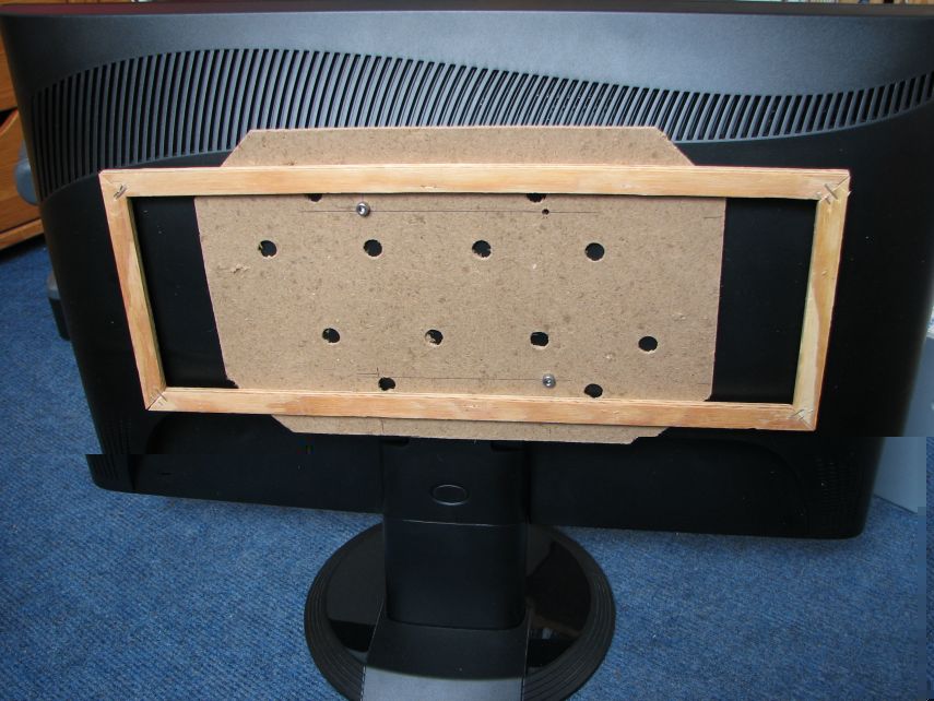 So, hier meine Hintergrundbeleuchtung für meinen TV-Monitor mit Vesa 100 halterung aus einer Mandarinenkiste und ein paar Holzleisten, die auf gehrung geschnitten sind. Das ganze hängt an einem 12V Schaltnetzteil.